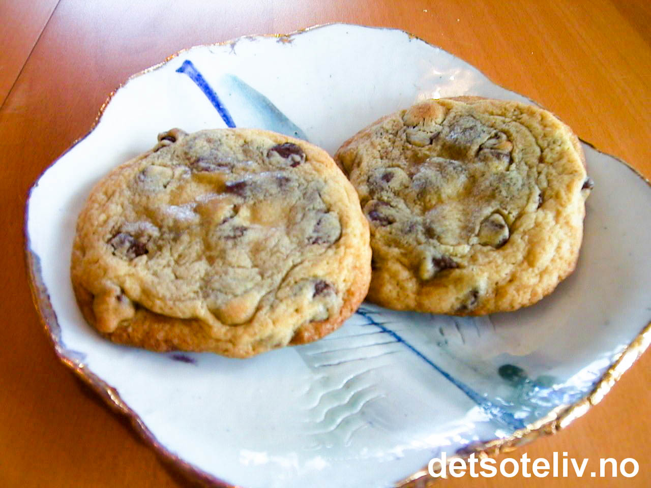 Stekes midt i ovnen ved 180°C i 12-15 min (kakene skal være litt gyldne i kantene). La cookiesene avkjøles på platen i 10 min, slik at de stivner litt før de forsiktig flyttes over på rist med en stekespade og avkjøles helt.